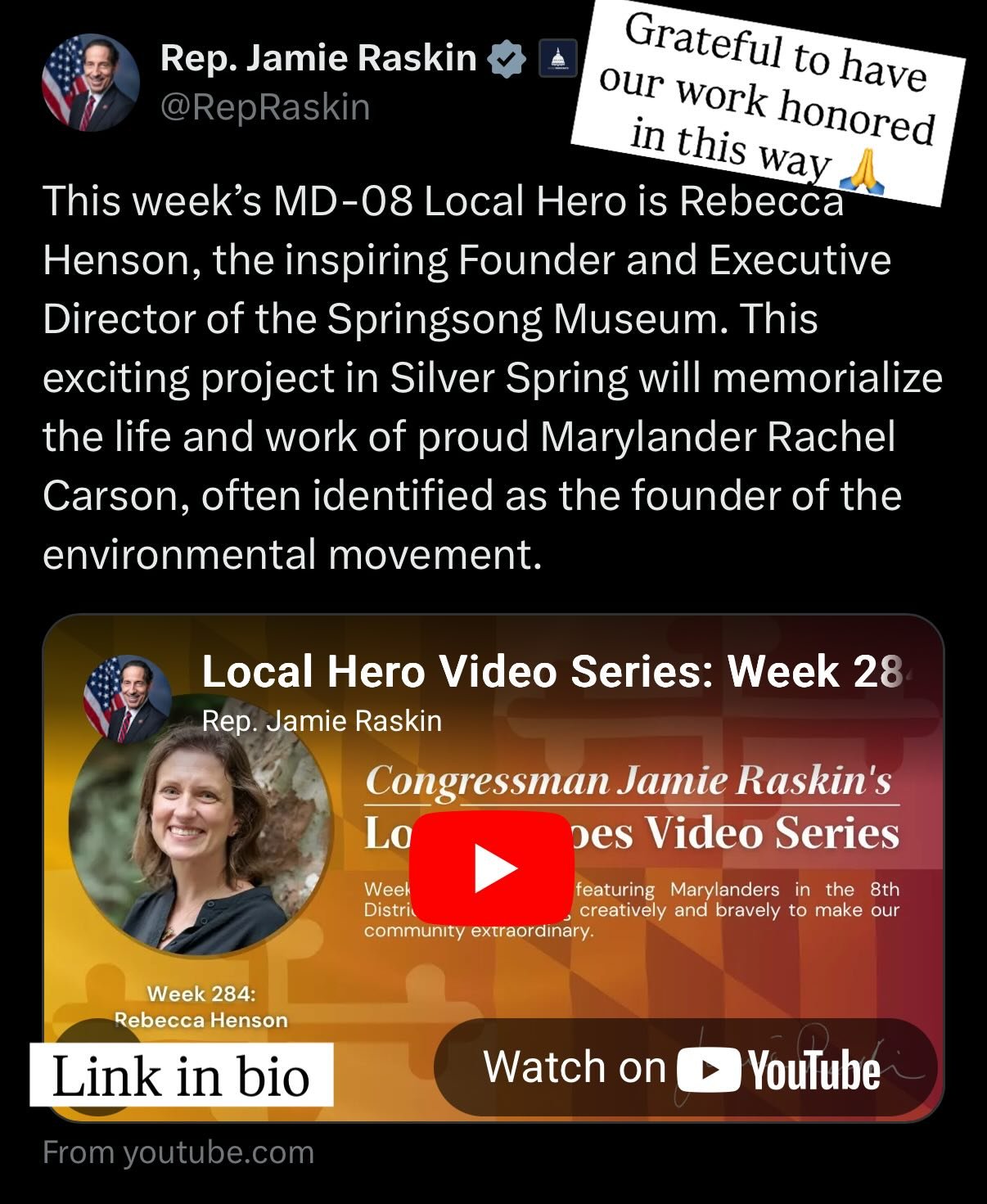 As we have been working to create Springsong over the past few years, we have talked with hundreds of people, many of whom have shared stories of how Carson changed something small or large in their lives -- everything from starting to plant their own tomatoes to pursuing a career in biological science. We realized that, though the difference Carson's Silent Spring made in sparking the modern environmental movement has been well documented, the effect she had (and continues to have) on the lives of individuals has not.